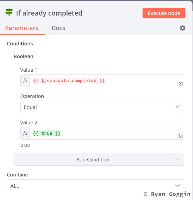 From the false output of the IF node (in todoist already), create an IF node (if already completed). Set it up as follows: