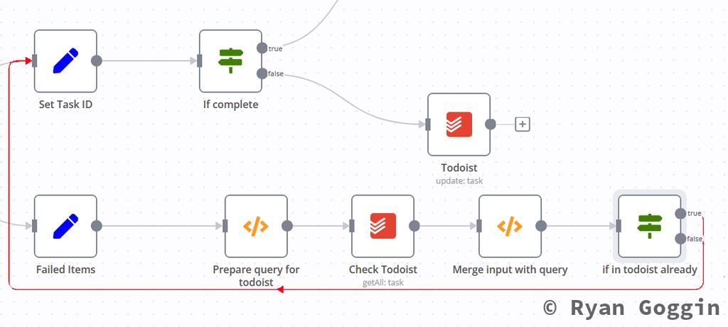From the true output of the IF node (in todoist already), connect it to the Set Task ID node created earlier.