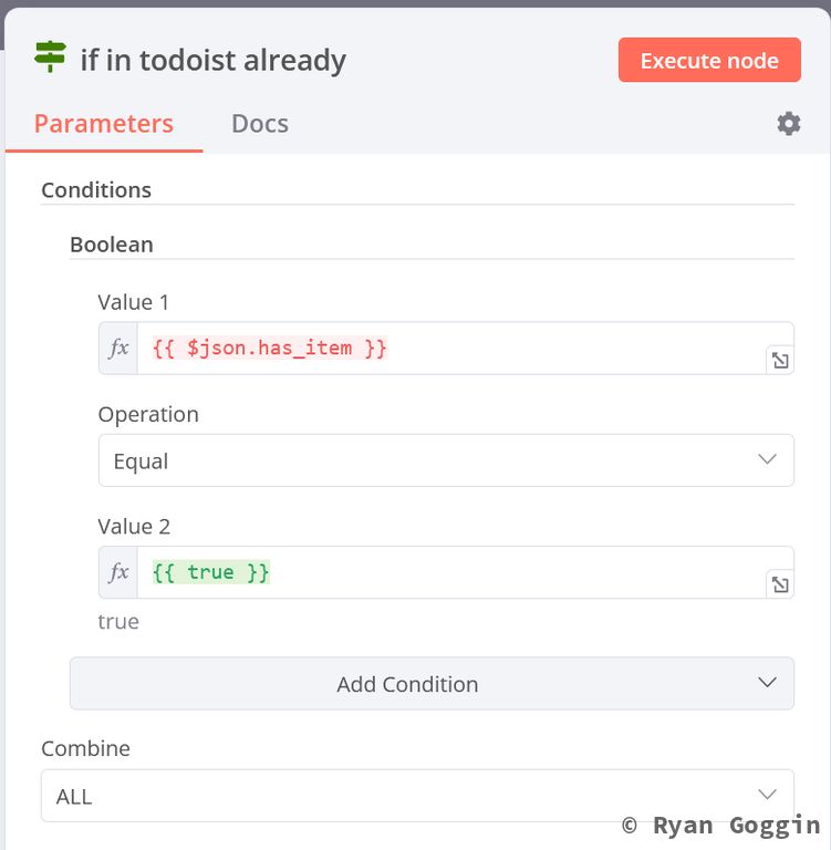 Create an IF node (in todoist already) to check if the task exists in Todoist (has_item == true). Set it up as follows: