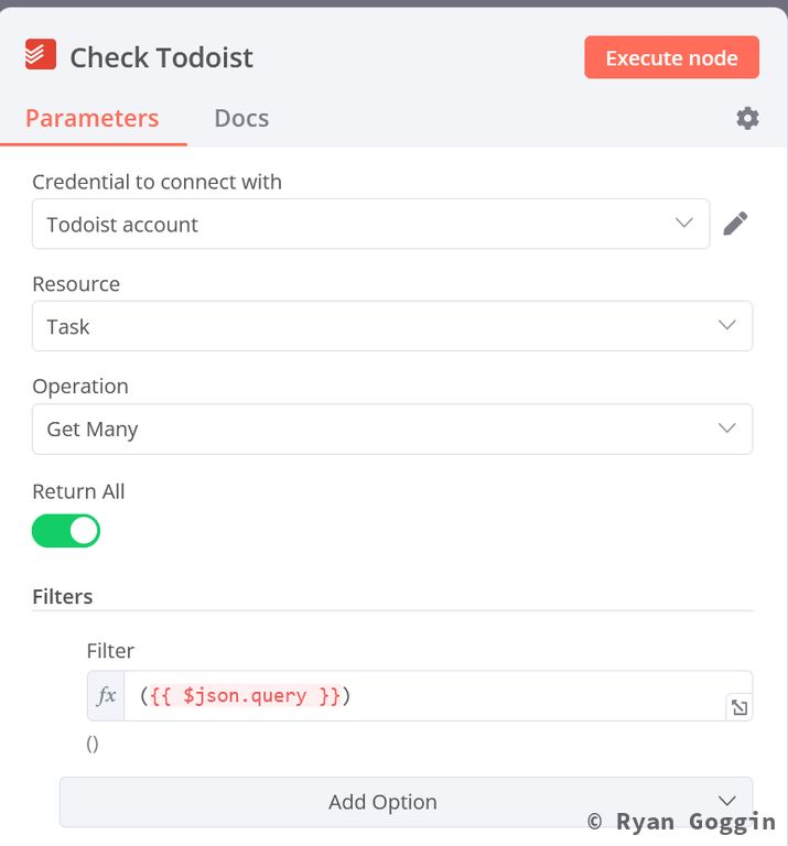 Create a Todoist - Get Many Tasks (Todoist Query) node to check if the task exists in Todoist. Set it up as follows: