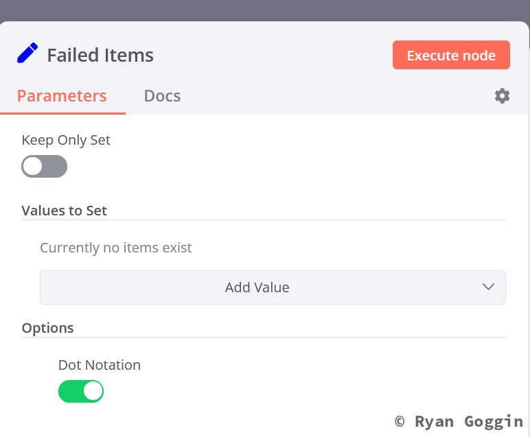 Then create a Code node to set the section and default priority. Set mode to Run One for all Items. Example code here: